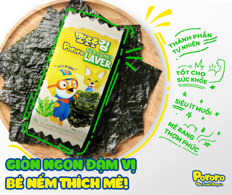 Rong biển ăn liền Pororo: hàm lượng dinh dưỡng vượt trội, cung cấp protein, vitamin và cực kỳ nhiều khoáng chất có lợi cho sức khỏe; vị đậm đà với dầu vừng và một chút muối; có thể mix với rất nhiều món ăn khác nhau của bé: ăn trực tiếp, cuộn cơm, làm cơm nắm,...