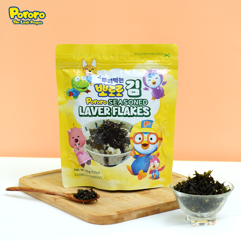 Rong biển rắc cơm Pororo: rong biển được cắt nhỏ sấy giòn, tan ngay trong miệng nên bé nào cũng có thể thưởng thức, kể các với các bé có kỹ năng nhai chưa tốt. Hàm lượng dinh dưỡng vượt trội, cung cấp protein, vitamin và cực kỳ nhiều khoáng chất có lợi cho sức khỏe. Đậm đà hương vị với mùi dầu vừng, dầu bắp thơm phức và chút xíu muối, thơm bùi vị hạt mè rang.