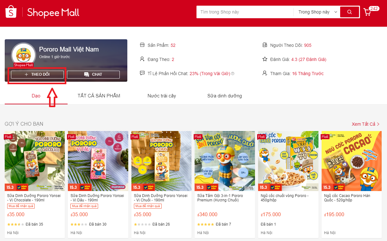 Shopee Pororo Mall Việt Nam liên tục cập nhật các sản phẩm mới nhất cùng hàng ngàn ưu đãi, mã freeship mỗi ngày, khách hàng đừng bỏ qua. Hãy ấn theo dõi shopee mall của Pororo mall Việt Nam tại đây nha: