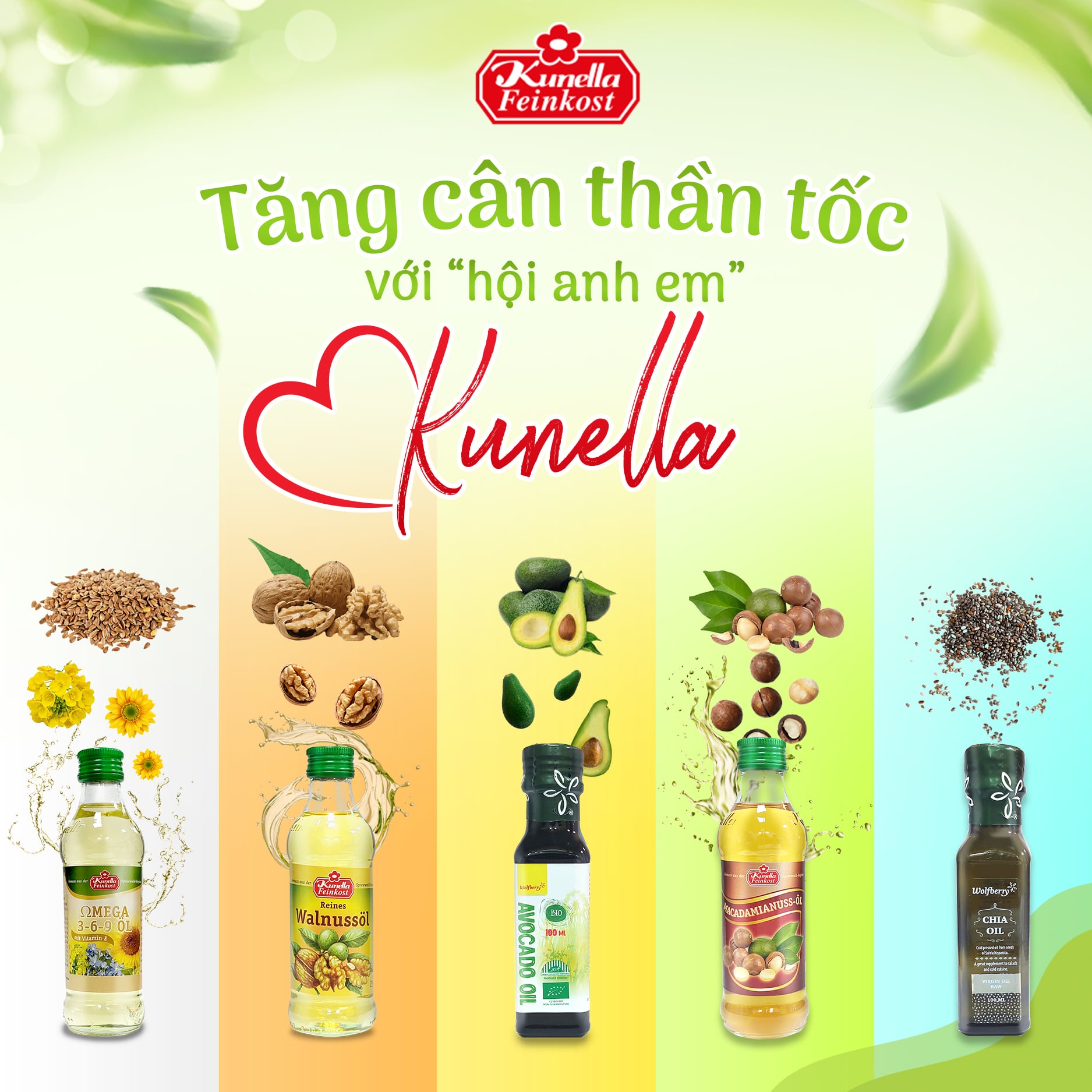 Bộ dầu ăn dặm Kunella chọn lọc những loại hạt giàu dinh dưỡng nhất, trải qua quy trình ép lạnh tiêu chuẩn quốc tế, mang đến những giọt dầu tinh túy. Các sản phẩm của Kunella đều sở hữu nhiều chất béo tốt, vitamin và khoáng chất quan trọng, là nguồn năng lượng dồi dào hỗ trợ bé tăng cân hiệu quả từ giai đoạn ăn dặm.