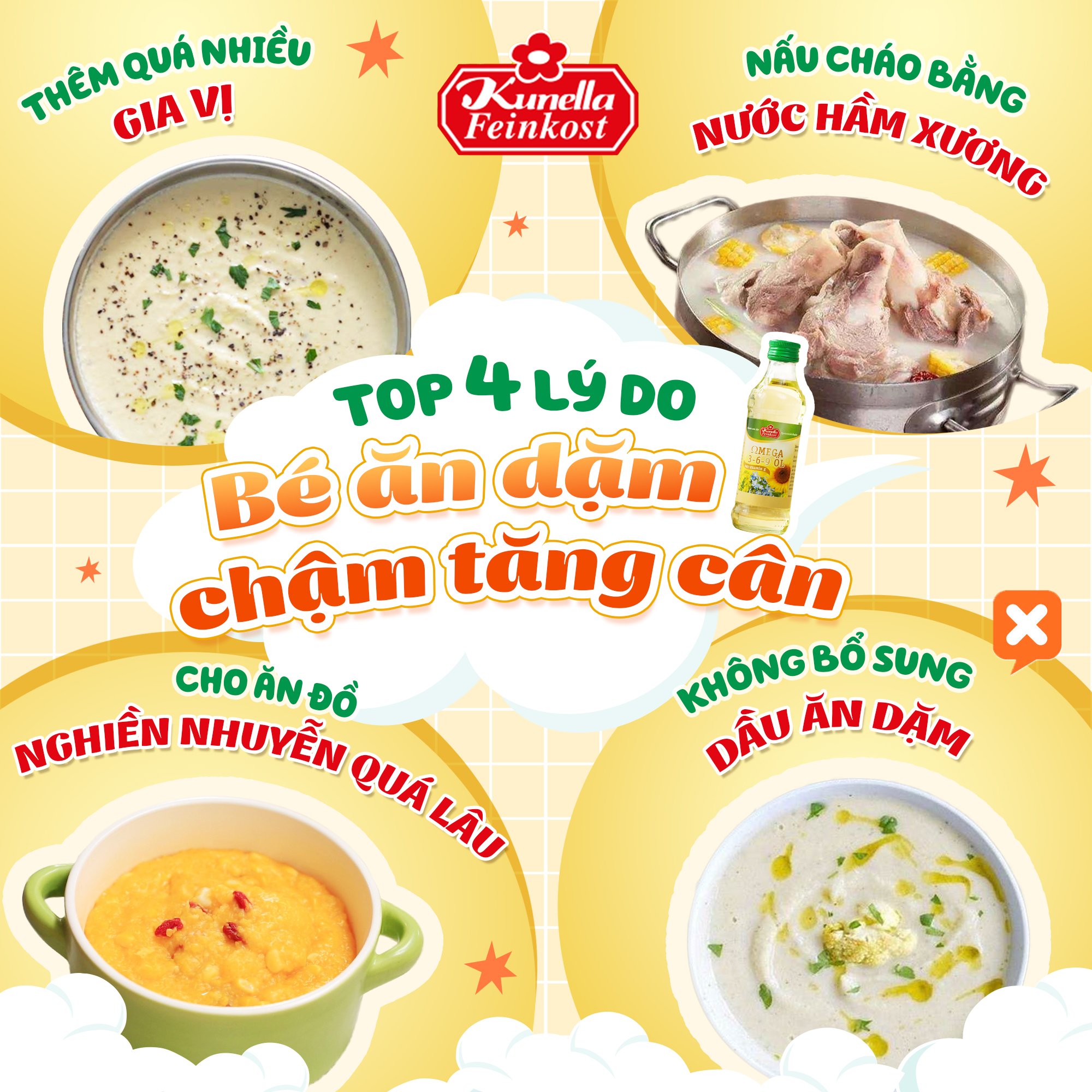 Để đạt được mong muốn về cân nặng cho bé, việc quan trọng nhất vẫn là mẹ cung cấp đầy đủ và đa dạng các nhóm chất dinh dưỡng trong những bữa ăn hàng ngày của bé. Dầu ăn dặm Kunella sẽ là chất xúc tác hiệu quả giúp bé ăn ngon hơn, để từ đó tăng cân hiệu quả và tự nhiên.